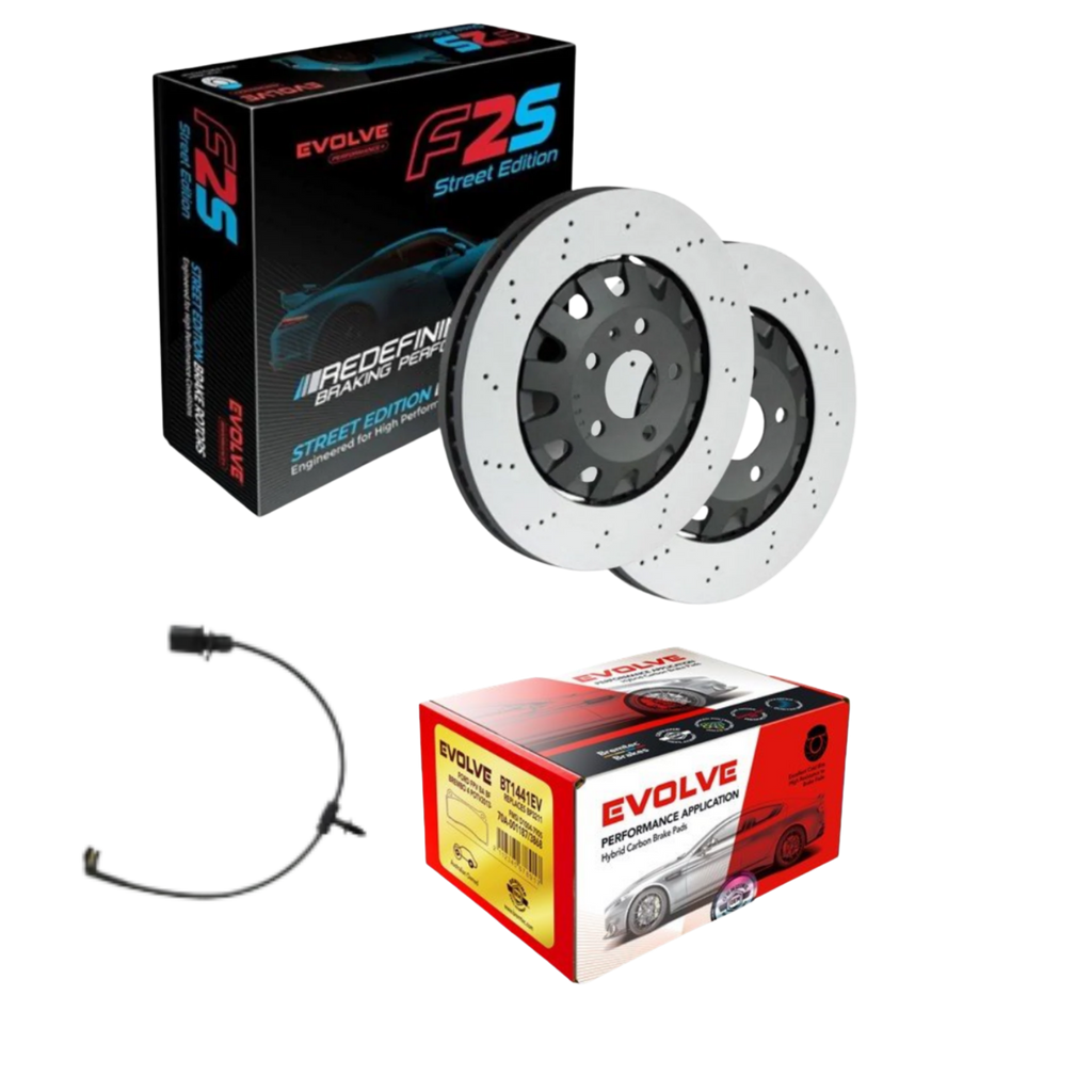 Package contains 330mm drilled brake rotors Bremtec BDR9008dev x2, brake pads Bremtec Evolve Ceramic Zero Dust