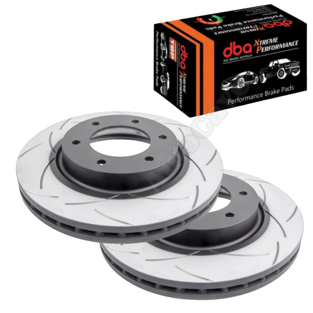 Package contains 2x DBA T2 slotted brake disc rotors (332mm) and choice of: