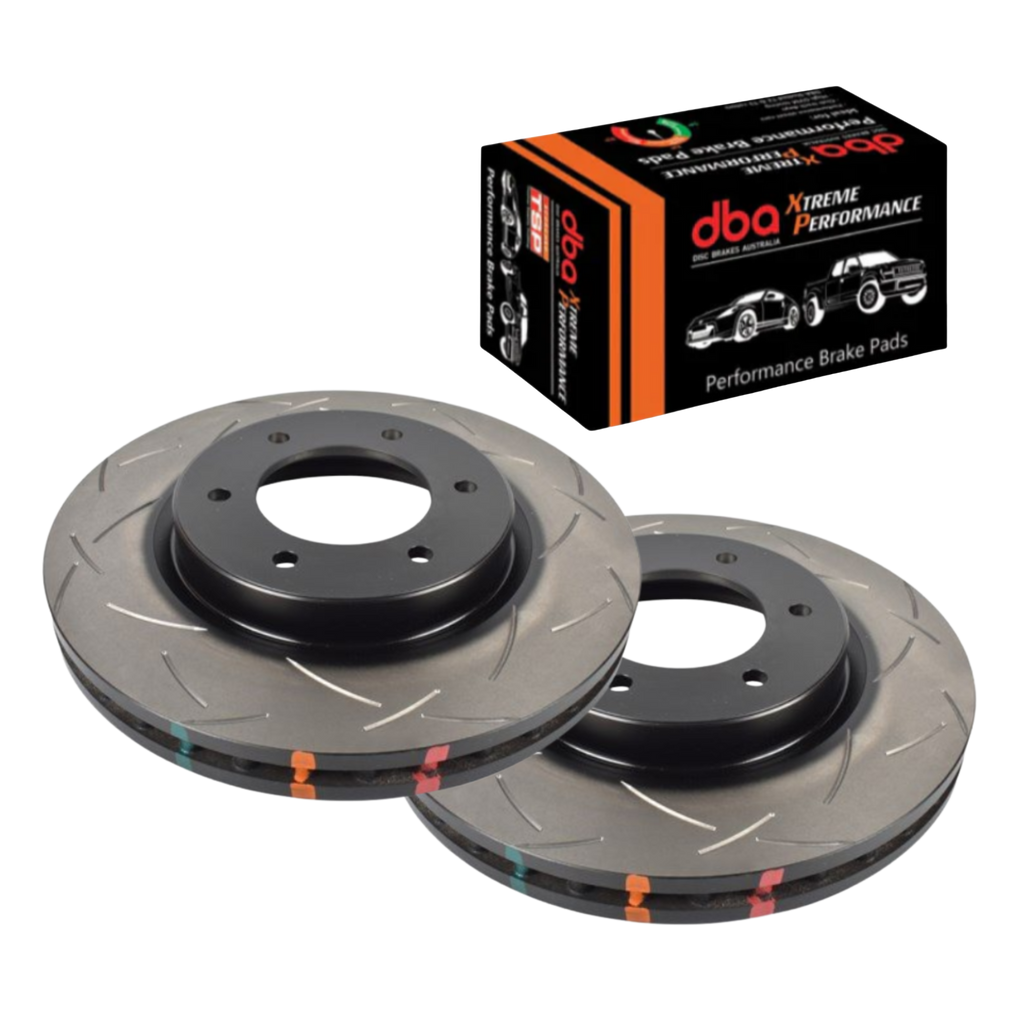 Package includes: DBA Australian made T3 4000 Series Slotted Heat treated rotors x2