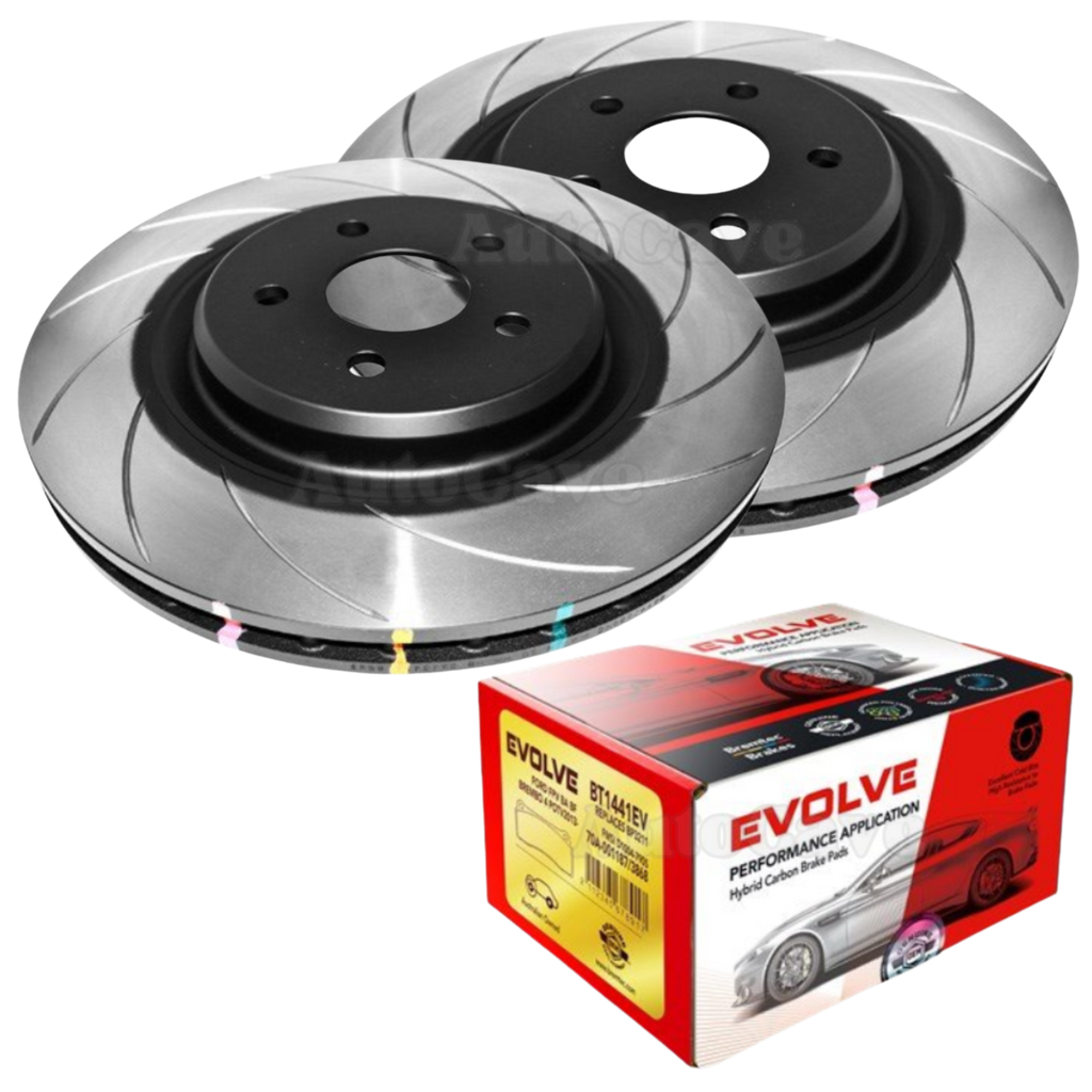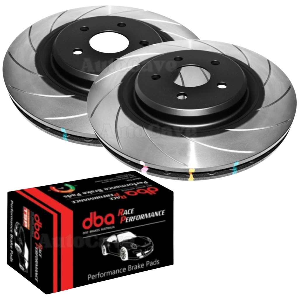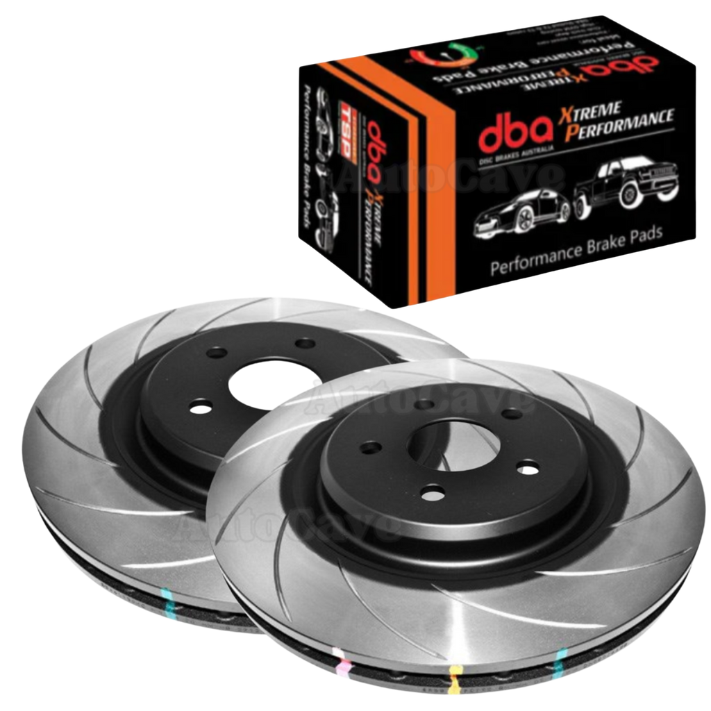 This package features DBA 4000 series T3 slotted brake disc rotors and your choice of brake pads: