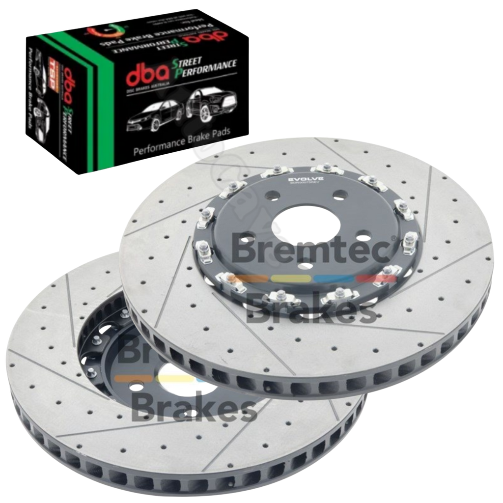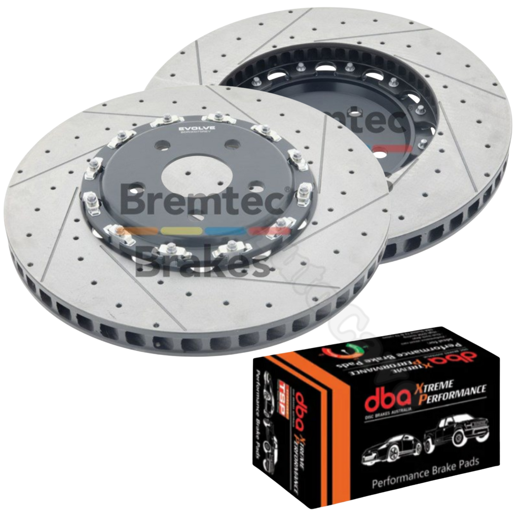 2x Front Bremtec Evolve F2S drilled and slotted brake disc rotors (400mm diameter), 2-piece design